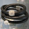 Armbånd af imiteret sort lædersnøre med magnetlås. Kan vikles 4 gange. Snøren er 7 mm tyk.